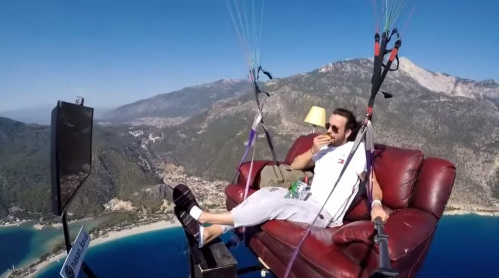 লকডাউনের মধ্যে ভাইরাল হওয়া একটি ভিডিওতে দেখা গেছে, তুর্কির এক সাহসী তরুণ আকাশে প্যারাসুটে ভেসে সোফায় বসে টিভি দেখছেন। স্বাভাবিকভাবেই সে অন্যান্য কাজকর্ম সাড়ছে।