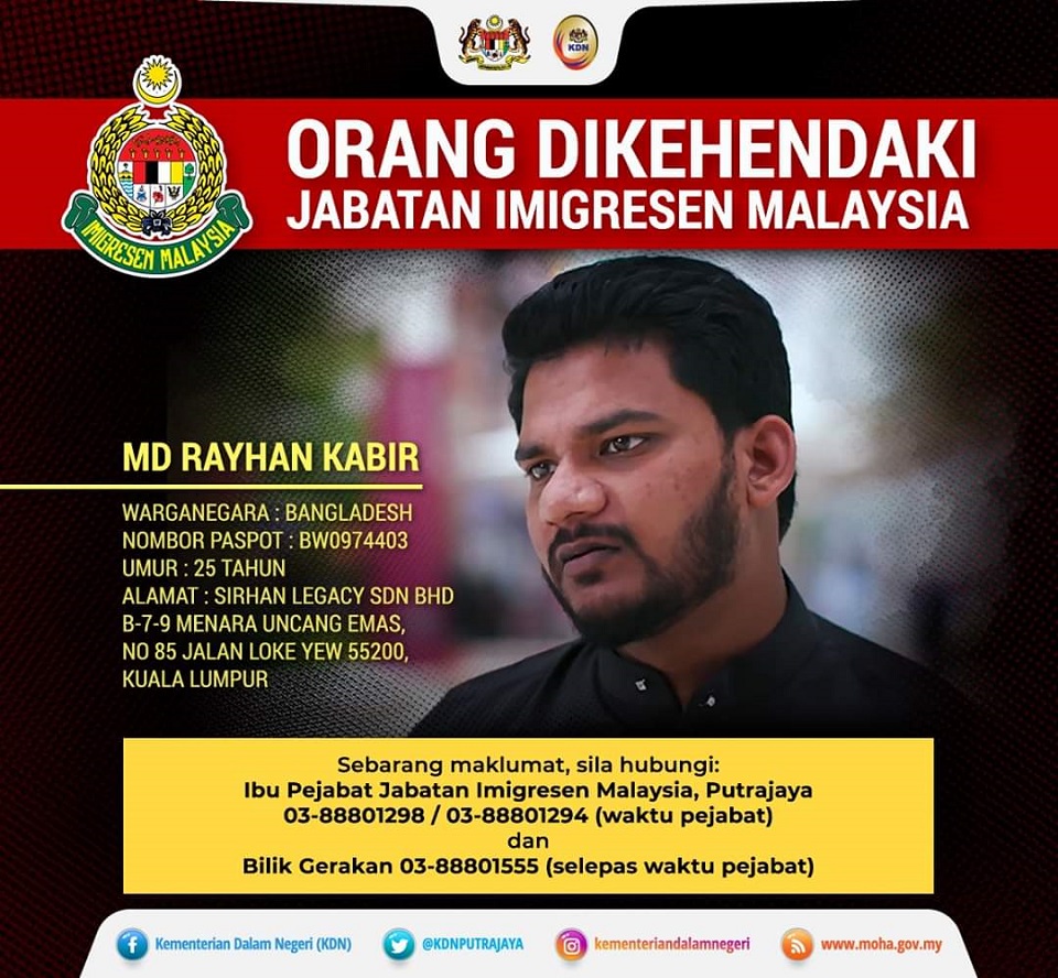 খবরে বলা হয়েছে, মালয়েশিয়ার অভিবাসন আইন ১৯৫৯/৬৩’র আওতায় তদন্তের জন্য রায়হান কবিরের সন্ধান চাইছে কর্তৃপক্ষ। বিবৃতিতে, রায়হান কবিরের অবস্থান সম্পর্কে কোনও তথ্য জানা থাকলে অভিবাসন কর্তৃপক্ষকে অফিস চলাকালে ফোন দিয়ে জানাতে বলা হয়েছে।