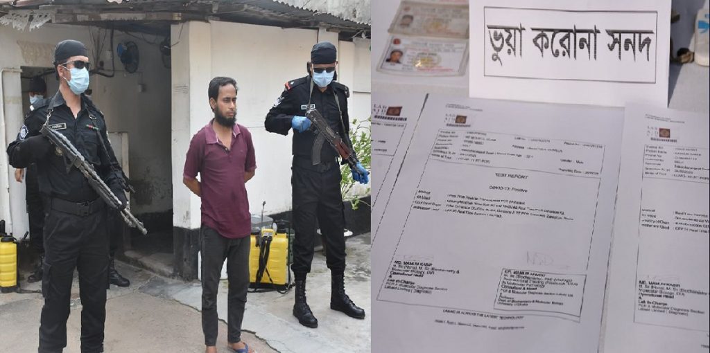 কুমিল্লায় বৈশ্বিক মহামারি করোনাভাইরাসের ভুয়া রিপোর্টসহ সকল ধরনের ভুয়া সার্টিফিকেট, জাতীয় পরিচয়পত্র ও সিলমোহর তৈরি করে প্রতারণার অপরাধে একজনকে গ্রেফতার করা হয়েছে।