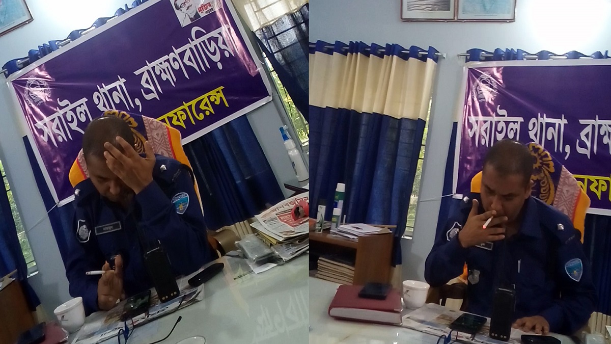 মাদকের বিরুদ্ধে পুলিশের জিরো টলারেন্স ঘোষণা দেওয়ার পর থানার ভেতর নিজ কক্ষে বসে প্রকাশ্যে ধূমপান করছেন ব্রাহ্মণবাড়িয়ার সরাইল থানার ভারপ্রাপ্ত কর্মকর্তা (ওসি) নাজমুল আহমেদ।