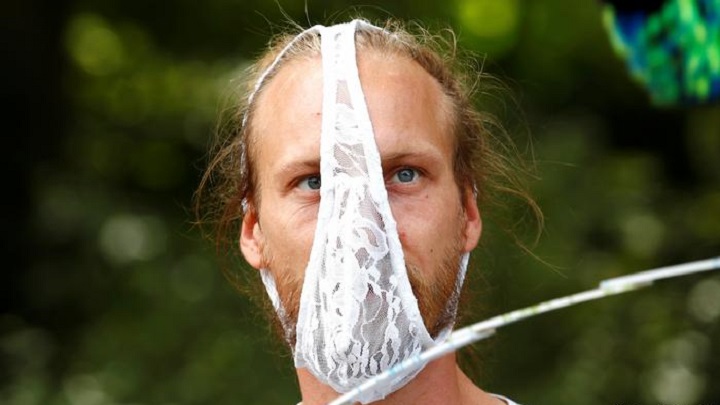 স্বাস্থ্যবিধিকে কটাক্ষ করতে এক বিক্ষোভকারী এসেছিলেন অন্তর্বাসে নাক-মুখ ঢেকে। সূত্র: ডয়লে ভেচে, ছবি: রয়টার।