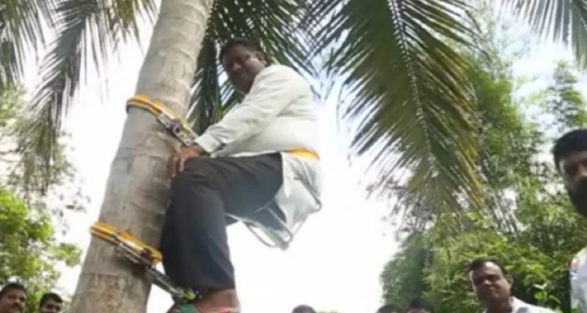 নারিকেল গাছে উঠে ভাষণ দিলেন মন্ত্রী! (ভিডিও)