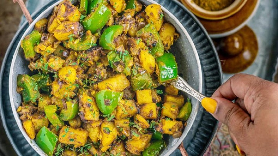 ক্যাপসিকাম ছোট ছোট টুকরো করে বিচি ফেলে ধুয়ে নিন। প্যানে তেল গরম করে সরিষা ও মেথি দিয়ে ভাজতে হবে। এর পর এতে মরিচের গুঁড়া ও হলুদের গুঁড়া দিন।