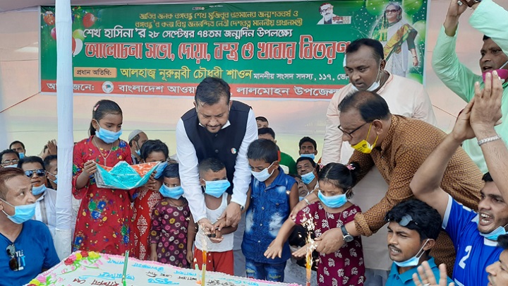 প্রধানমন্ত্রী শেখ হাসিনার ৭৪তম জন্ম দিনে ভোলার লালমোহনে লঞ্চ ভাড়া করে তেঁতুলিয়া নদীর বুকে বিচ্ছিন্ন চর কচুয়াখালী গিয়ে কেক কাটলেন এমপি নূরুন্নবী চৌধুরী শাওন।