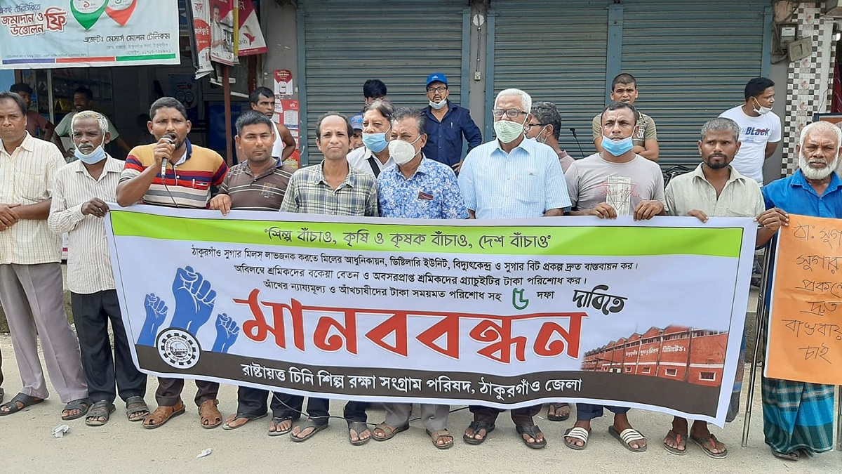 সংগঠনটির আহ্বায়ক মাহবুবুর রহমান রুবেলের সভাপতিত্বে মানববন্ধনে ঠাকুরগাঁও সুগার মিলের শ্রমিক, কৃষকসহ বিভিন্ন শ্রেণি পেশার মানুষ অংশ নেয়।