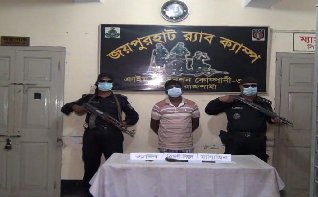 জয়পুরহাটে ১টি বিদেশি পিস্তল, ৭ রাউন্ড গুলি ও ম্যাগজিনসহ রাজিব ইসলাম নামে এক শীর্ষ অস্ত্র ব্যবসায়ীকে আটক করেছে র্যাব-৫ জয়পুরহাট ক্যাম্পের সদস্যরা।