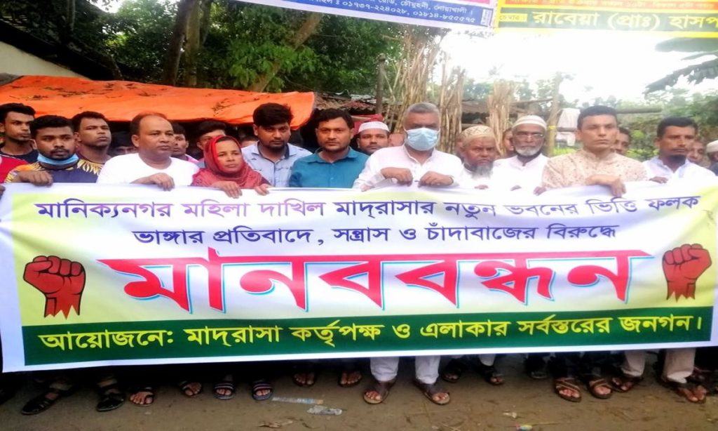 নোয়াখালীর সোনাইমুড়ির মানিক্যনগর মহিলা দাখিল মাদরাসার নব নির্মিত একাডেমিক ভবনের নামফলক ভাঙচুর, সন্ত্রাস ও চাঁদাবাজের বিরুদ্ধে মাদরাসা কর্তৃপক্ষ ও এলাকাবাসীর উদ্যোগে মাদরাসার সামনের সড়কে মানববন্ধন ও বিক্ষোভ মিছিল হয়েছে।