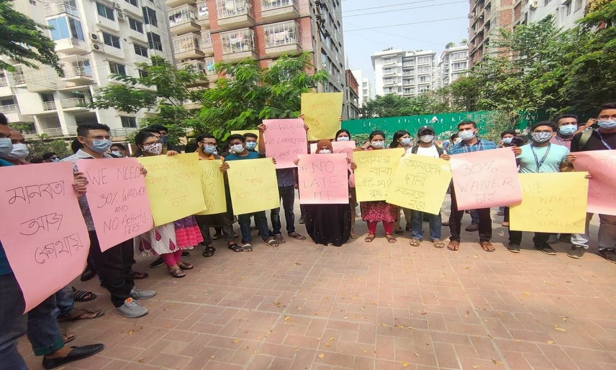 করোনা মহামারিতে ক্লাস না করেও নর্থ সাউথ বিশ্ববিদ্যালয়ের ছাত্র-ছাত্রীরা ল্যাব ফি, লাইব্রেরি ফিসহ অন্যান্য সকল ফি পরিশোধ করেছেন। এই সকল অতিরিক্ত ফি বাতিল করতে বিশ্ববিদ্যালয়ের সামনে মানববন্ধন করেছেন বিশ্ববিদ্যালয়টির শিক্ষার্থীরা।