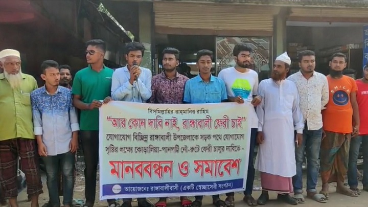 সোমবার দুপুরে রাঙ্গাবালী উপজেলা প্রেসক্লাবের সামনে ‘রাঙ্গাবালী বাঁশি’ নামের একটি স্বেচ্ছাসেবী সংগঠনের আয়োজনে ঘণ্টাব্যাপী এ মানববন্ধন কর্মসূচি পালিত হয়।