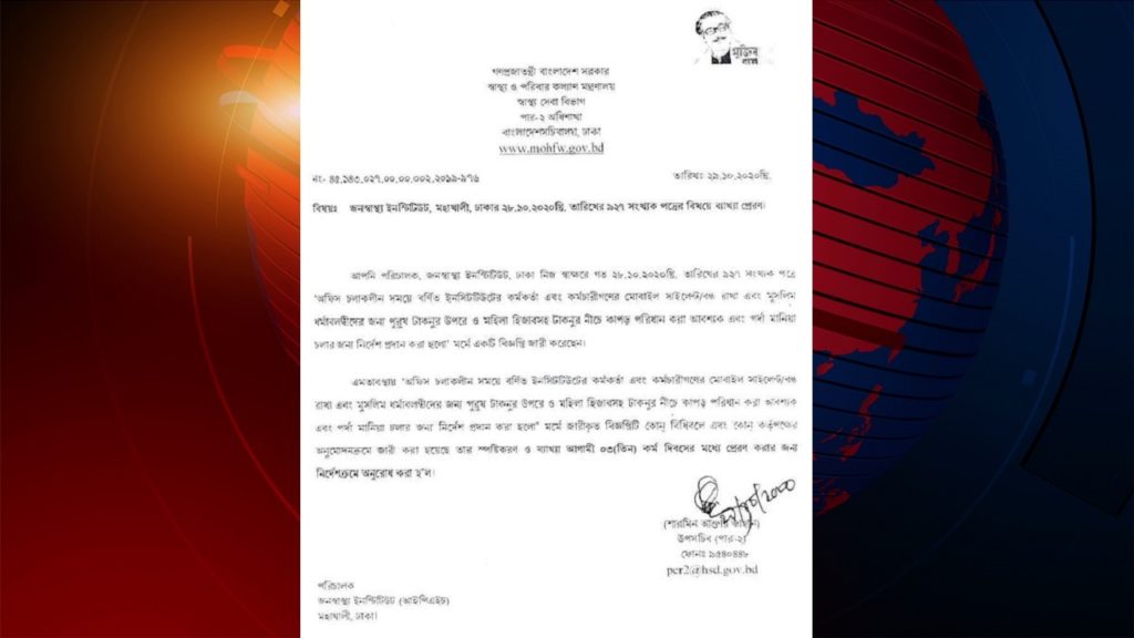 মুসলিম পুরুষ কর্মকর্তা/কর্মচারীদের টাখনুর উপর জামা পরিধান ও মহিলা কর্মকর্তা/কর্মচারীদের হিজাব ও টাখনুর নিচে জামা পরিধান করা ও পর্দা মেনে অফিস করার বিজ্ঞপ্তি দেয়াতে জনস্বাস্থ্য ইনস্টিটিউটের পরিচালক ডা. মুহাম্মদ আব্দুর রহিমকে শোকজ করেছে স্বাস্থ্য ও পরিবার কল্যাণ মন্ত্রণালয়।