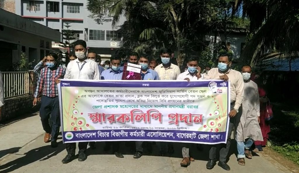 এ সময় বাংলাদেশ বিচার বিভাগীয় কর্মচারী অ্যাসোসিয়েশন, বাগেরহাট জেলা শাখার সভাপতি অমিত রায়, সহ-সভাপতি অঞ্জন দাশ, সাধারণ সম্পাদক এফ. এম. জাহাঙ্গীর হাসান, সহ-প্রচার সম্পাদক ইমতিয়াজ শাওনসহ সদস্যরা উপস্থিত ছিলেন।