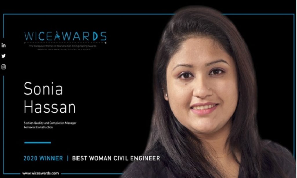 সিভিল ইঞ্জিনিয়ার ক্যাটাগরিতে ইউরোপিয়ান ওমেন ইন কন্সট্রাকশন এন্ড ইঞ্জিনিয়ারিং (WICEAWARDS) অ্যাওয়ার্ড পাচ্ছেন বাংলাদেশি সোনিয়া হাসান। যুক্তরাজ্যের বিভিন্ন নির্মাণ সংস্থায় কাজ করা সোনিয়া বর্তমানে hs2 (হাইস্পিড-২) প্রকল্পের গুণমান পরিচালক হিসাবে ‘ফেরোভিয়াল কনস্ট্রাকশন’ নামক প্রতিষ্ঠানে কাজ করছেন ।