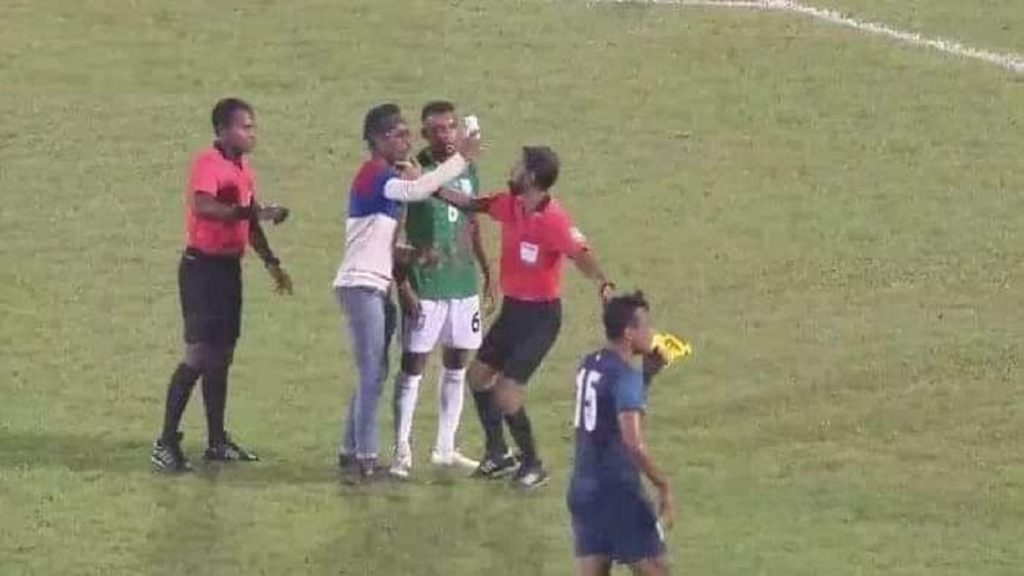 বাংলাদেশ অধিনায়ক জামাল ভূঁইয়ার সঙ্গে সেলফি তোলার চেষ্টা করছিলেন তিনি। পরে সেই তরুণকে নিরাপত্তা কর্মীরা মাঠের বাইরে নিয়ে আসেন। নিজেদের হেফাজতে রাখলেও তার বিরুদ্ধে কী ধরনের ব্যবস্থা নেওয়া হবে এ ব্যাপারে তারা কিছু পরিষ্কার করেনি।