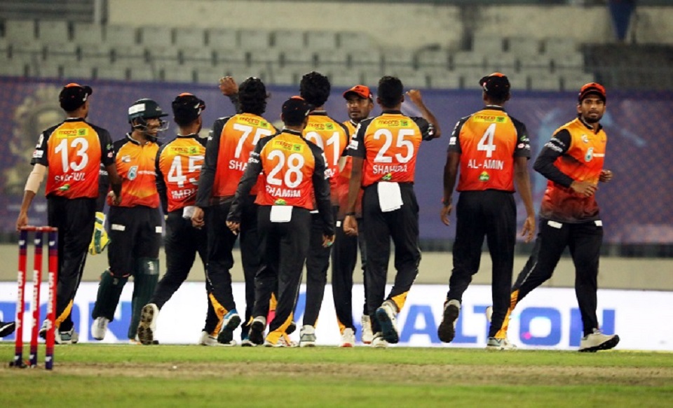 পঞ্চম ওভারে মিরাজের বলে লং অনে ইমনের হাতে ধরা পড়েন রিয়াদ। পরের ওভারে সাকিবকে ফেরান সুমন খান। পরে ৪২ রানের জুটি গড়েন জহুরুল ইসলাম ও আরিফুল হক। ২৬ বলে ৩১ রান করে ইনিংসের ১৩-তম ওভারে উইকেটরক্ষকের হাতে ক্যাচ হন তিনি। সাত নম্বর পজিশনে নেমে শামীম হোসেন ১৮ বলে ২৬ রান করেন।