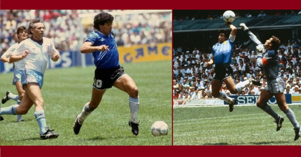 ১৯৮৬ বিশ্বকাপ বিশ্ব ফুটবলে আর্জেন্টিনাকে এক প্রকার একক প্রচেষ্টায় জেতান বিশ্বকাপ। সেরা খেলোয়াড় হিসেবে জিতেছিলেন স্বর্ণ পদকও। সেই বিশ্বকাপেই ইংল্যান্ডের বিপক্ষে কোয়ার্টার ফাইনালে ২-১ গোলে জয় পেয়েছিল আর্জেন্টিনা। দুটি গোলই করেছিলেন ম্যারাডোনা। আর সেই গোল দুটিই তৈরি করেছে ইতিহাস। প্রথম গোলটি ছিল আলোচিত-বিতর্কিত ‘হ্যান্ড অফ গড’। এই নাম করণের কারণ হলো বলটি ইংল্যান্ডের জালে ঢুকার আগে ম্যারাডোনার হাতে লেগেছিল। কিন্তু রেফারি সেটিকে হ্যান্ডবল দেননি। কারণ সাধারণ দেখায় মনে হচ্ছিল ম্যারাডোনা বলটি হেড করে গোল দিয়েছেন। পরবর্তীতে ম্যারাডোনা বলেছিলেন, ঈশ্বর তার হাত দিয়ে গোলটি করিয়েছিলেন। সেই থেকে হ্যান্ড অফ গড।