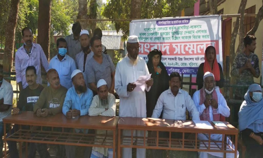 আখাউড়া-লাকসাম নির্মাণাধীন ডাবল রেললাইন প্রকল্পের ক্ষতিগ্রস্ত পরিবারকে ক্ষতিপূরণ দিয়ে উচ্ছেদ অভিযান করার দাবিতে সংবাদ সম্মেলন হয়েছে। রোববার দুপুরে ব্রাহ্মণবাড়িয়ার আখাউড়া পৌর শহরের দেবগ্রাম স্কুল মাঠে ক্ষতিগ্রস্ত অর্ধশতাধিক পরিবার এ সংবাদ সম্মেলন করেন।