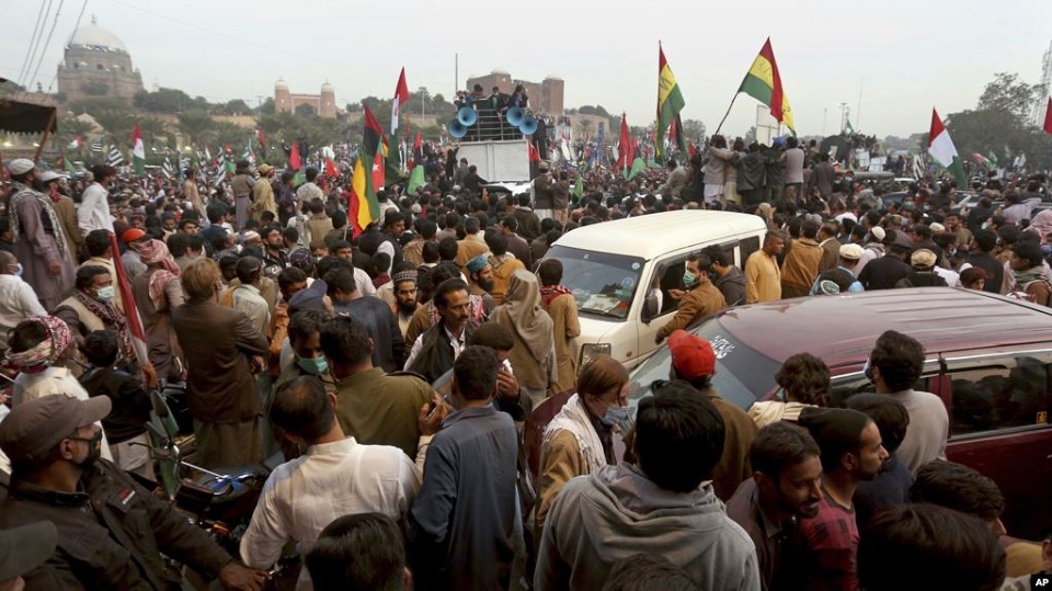 নিষেধাজ্ঞা উপেক্ষা করেই সরকার বিরোধী ব্যাপক বিক্ষোভ হয়েছে পাকিস্তানে। সোমবার মুলতানে বিরোধী দলগুলোর ডাকা সমাবেশে যোগ দেয় হাজারো মানুষ।