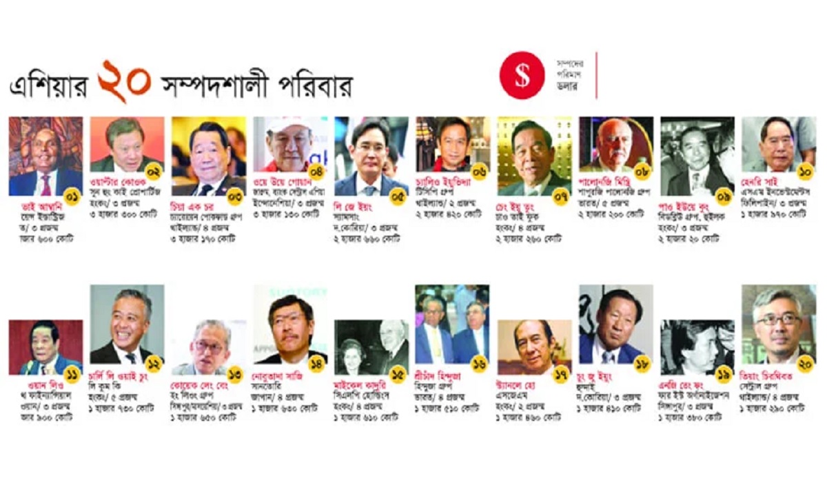 এশিয়ার শীর্ষ ২০ ধনী পরিবারের হাতে বিপুল পরিমাণ সম্পদ রয়েছে। সম্প্রতি ব্লুমবার্গ ওয়েলথ প্রতিবেদনে বলা হয়, এশিয়ায় ২০টি পরিবারের হাতে ৩৯ লাখ ৮১ হাজার ৮০০ কোটি টাকা (৪৬ হাজার ৩০০ কোটি ডলার) রয়েছে।