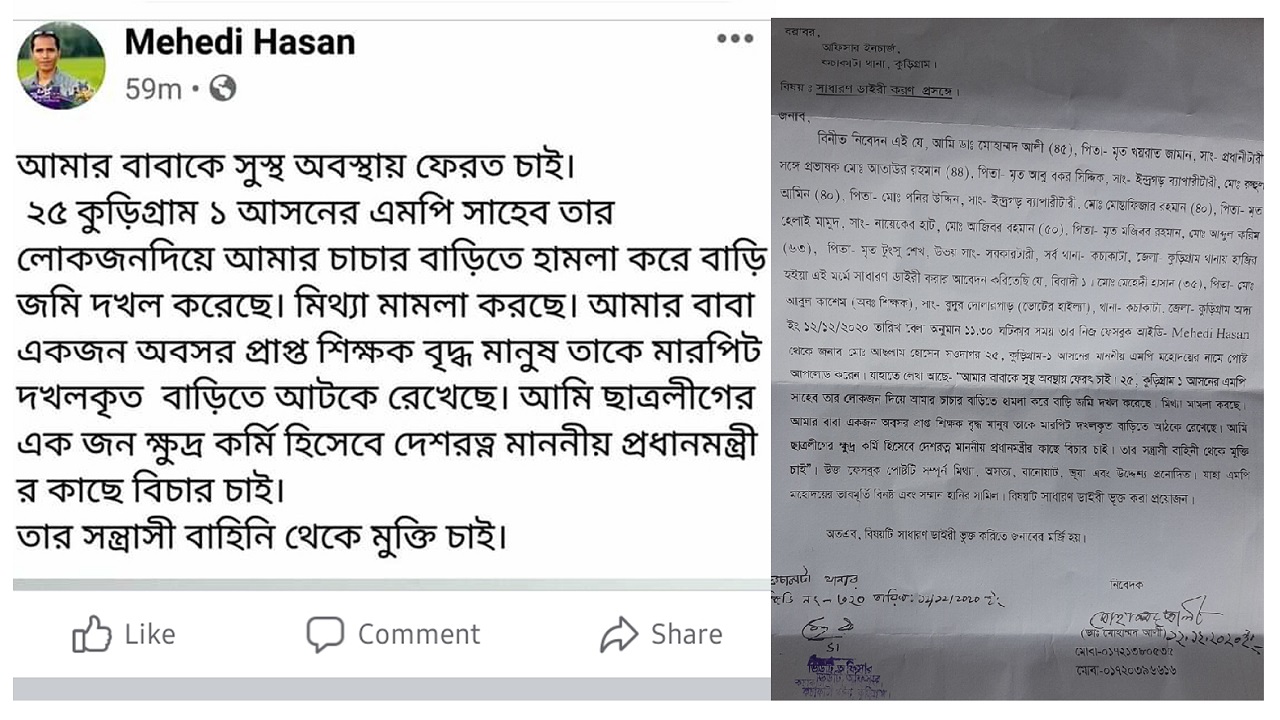 শনিবার সকাল ১১টার দিকে ফেসবুক পোস্টে মেহেদি হাসান লেখেন, “আমার বাবাকে সুস্থ অবস্থায় ফেরত চাই। ২৫ কুড়িগ্রাম-১ আসনের এমপি সাহেব তার লোকজন দিয়ে আমার চাচার বাড়িতে হামলা করে বাড়ি জমি দখল করেছে। মিথ্যা মামলা করছে। আমার বাবা একজন অবসরপ্রাপ্ত শিক্ষক বৃদ্ধ মানুষ তাকে মারপিট দখলকৃত বাড়িতে আটকে রেখেছে। আমি ছাত্রলীগের একজন ক্ষুদ্র কর্মী হিসেবে দেশরত্ন মাননীয় প্রধানমন্ত্রীর কাছে বিচার চাই। তার সন্ত্রাসী বাহিনী থেকে মুক্তি চাই।”