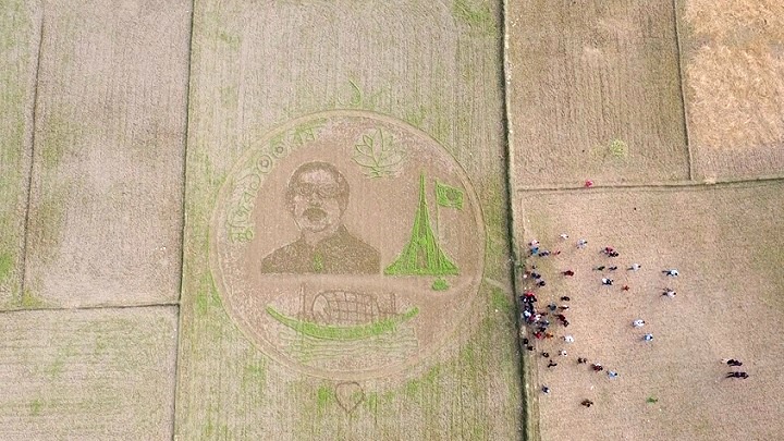 দিগন্তজোড়া ফসলের মাঠ। এর মধ্যেই ভেসে উঠেছে বঙ্গবন্ধুর প্রতিকৃতি। না কোন রংয়ের ছোঁয়ায় নয়, নয় কোন শিল্পীর তৈরি। ময়মনসিংহের ঈশ্বরগঞ্জ উপজেলার আঠারোবাড়ি ইউনিয়নের পাড়া খালবলা গ্রামের কৃষক আব্দুল কাদিরের অনন্য সৃষ্টি এটি। লাল শাক ও সরিষা লাগিয়ে করেছেন তৈরি করেছেন বঙ্গবন্ধুর আকৃতি।