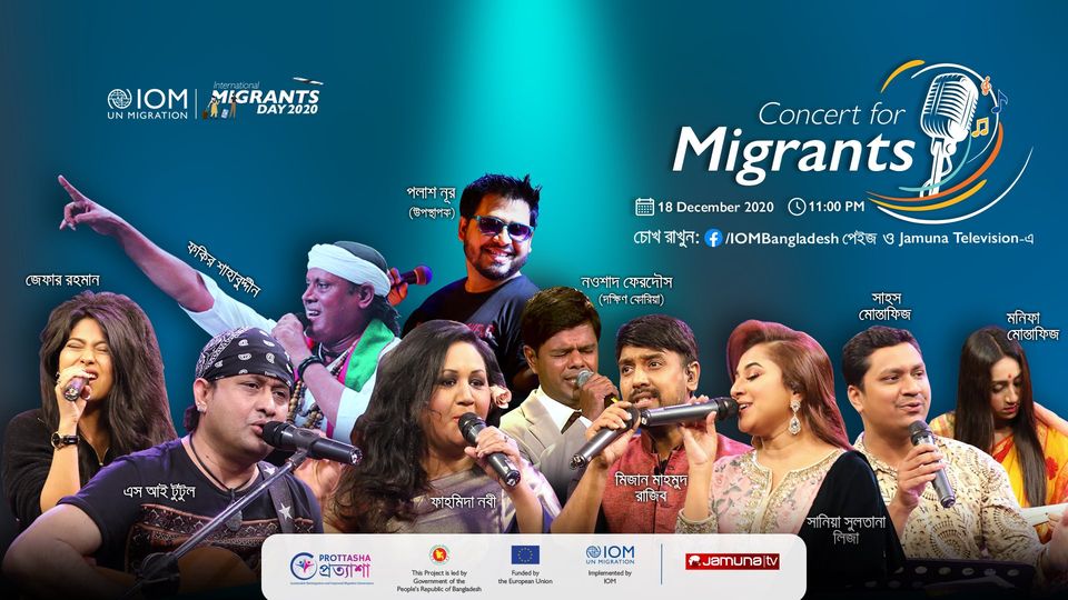 আন্তর্জাতিক অভিবাসী দিবস ২০২০ উপলক্ষে সকল অভিবাসী, অভিবাসন প্রত্যাশী, অভিবাসীদের পরিবার এবং কমিউনিটির জন্য আন্তর্জাতিক অভিবাসন সংস্থা কর্তৃক আয়োজিত হতে যাচ্ছে ভার্চুয়াল কনসার্ট ‘কনসার্ট ফর মাইগ্রেন্টস’। ১৮ ডিসেম্বর রাত ১১ টায় কনসার্টটি প্রদর্শিত হবে আইওএম বাংলাদেশের ফেসবুক পেজ ও যমুনা টেলিভিশনের পর্দায়।