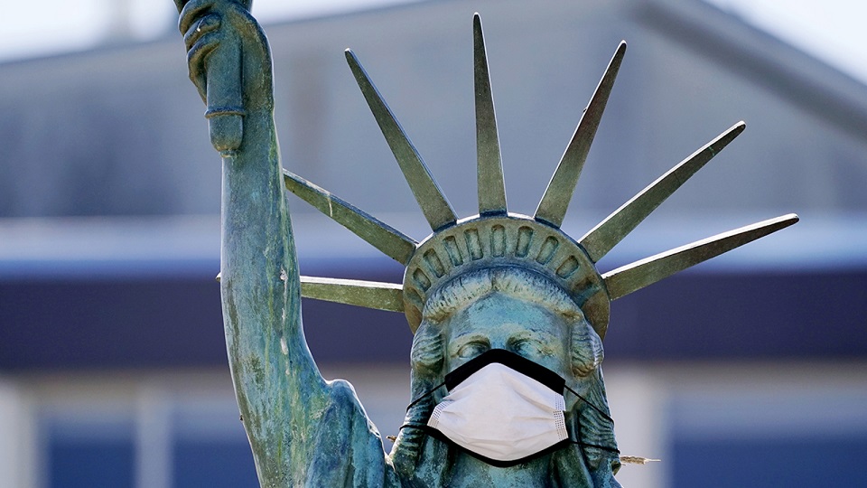 FILE - In this Aug. 26, 2020, file photo, the face on a replica of the Statue of Liberty covers with a protective face mask against the coronavirus. The 1/18th scale replica on Seattle's Alki Beach was erected in 1952 and recast in 2006. (AP Photo/Elaine Thompson)