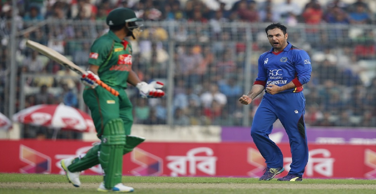 Afghanistan's Mohammad Nabi, right, celebrates the dismissal of Bangladesh's Shakib Al Hasan, left, during the second one-day international cricket match in Dhaka, Bangladesh, Wednesday, Sept. 28, 2016. (AP Photo/A.M. Ahad)