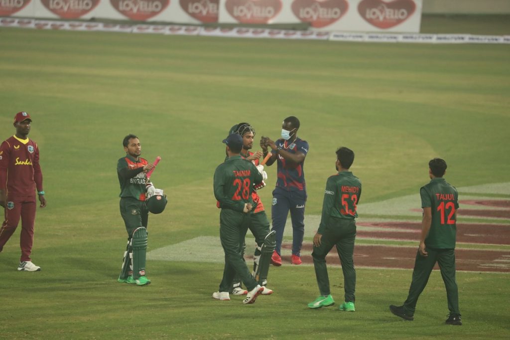 উইন্ডিজের বিপক্ষে সিরিজের প্রথম ওয়ানডেতে ৬ উইকেটের জয় পেয়েছে বাংলাদেশ। মিরপুর শের-ই-বাংলা ক্রিকেট স্টেডিয়ামে টস জিতে ফিল্ডিং করতে নেমে টাইগারদের বোলিং তোপে মাত্র ১২২ রানেই থেমে যায় উইন্ডিজের ইনিংস। জবাবে ব্যাট করতে নেমে ৯৭ বল হাতে রেখেই ৬ উইকেটের বড় জয় পায় বাংলাদেশ। ম্যান অব দ্যা ম্যাচ হয়েছেন নিষেধাজ্ঞা কাটিয়ে ফেরা বিশ্বসেরা অলরাউন্ডার সাকিব আল হাসান।