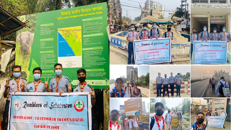 পায়ে হেঁটে ১৫০ কিলোমিটার পরিভ্রমণ করলেন সেবাব্রতী মুক্ত স্কাউট গ্রুপের চারজন রোভার স্কাউট সদস্য। গত ১৬ই জানুয়ারি চট্টগ্রাম থেকে রওনা দিয়ে পর্যায়ক্রমে গাছবাড়িয়া, লোহাগড়া, চকোরিয়া ও রামু হয়ে আজ (২০ জানুয়ারি) কক্সবাজারের হিমছড়িতে তাদের এই পরিভ্রমণ শেষ হয়।