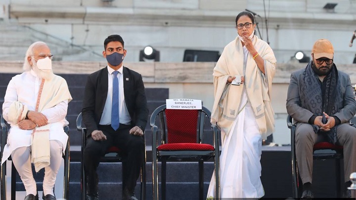 এর পরে মমতা বলেন, ‘আমায় এখানে আমন্ত্রণ জানানোর জন্য আমি প্রধানমন্ত্রী এবং কেন্দ্রীয় সংস্কৃতি-মন্ত্রীর কাছে কৃতজ্ঞ। কিন্তু কাউকে আমন্ত্রণ করে বেইজ্জত করাটা শোভনীয় নয়। এর প্রতিবাদে আমি এখানে কিছু বলছি না। জয় হিন্দ! জয় বাংলা!’ আর এর পরেই মমতা পোডিয়াম ছেড়ে নিজের আসনে বসেন। কিন্তু সেখানে নীরবে বসেছিলেন প্রধানমন্ত্রী নরেন্দ্র মোদী।