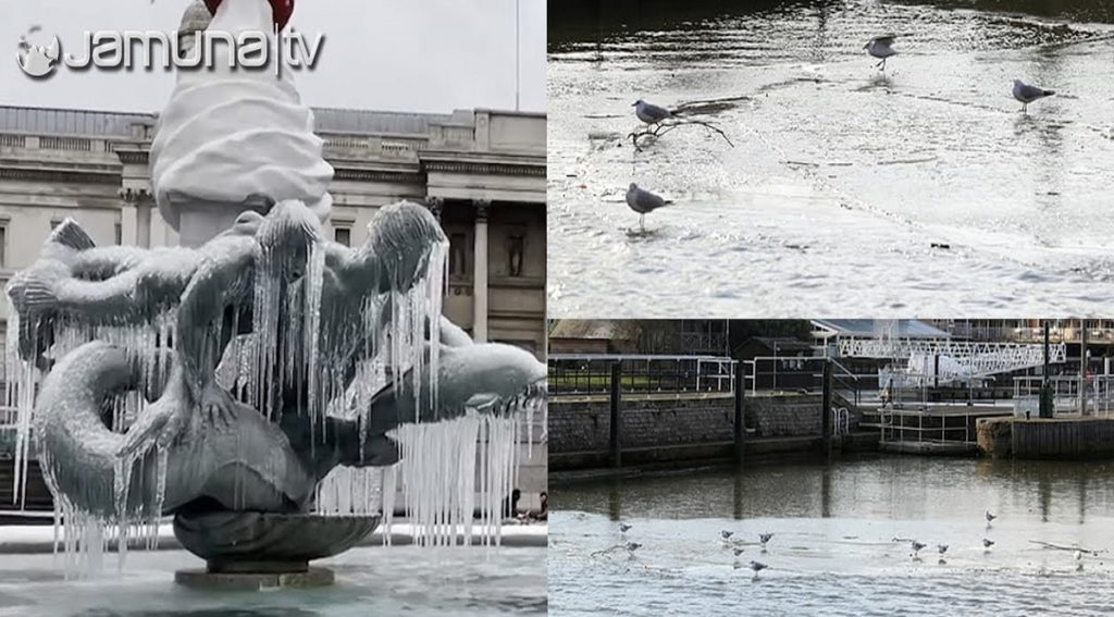 স্থানীয় গণমাধ্যমে প্রকাশিত ছবিতে, পাতলা বরফের ওপর ঘুরে বেড়াতে দেখা যাচ্ছে শীতের পাখিদের। বাল্টিক অঞ্চল থেকে বয়ে আসা হিমেল হাওয়ায় টেডিংটন লক এলাকায় নদীর পানি জমে যাওয়ায় দেখা মিলছে মনোমুগ্ধকর এ দৃশ্যের। এলাকাটিতে টেমস নদীর পানি তেমন স্রোতশীল নয় বলে তৈরি হয়েছে এমন পরিস্থিতি।