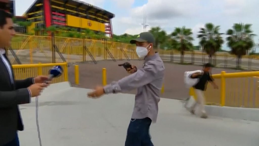 পুরো ডাকাতির ঘটনাই ধারণ হয় ক্যামেরায়। গায়াকিল শহরে এস্তাদিও মনুমেন্টালের সামনে থেকে লাইভ দিচ্ছিলেন এই ক্রীড়া সাংবাদিক ডিয়েগো ওরডিনোলা।