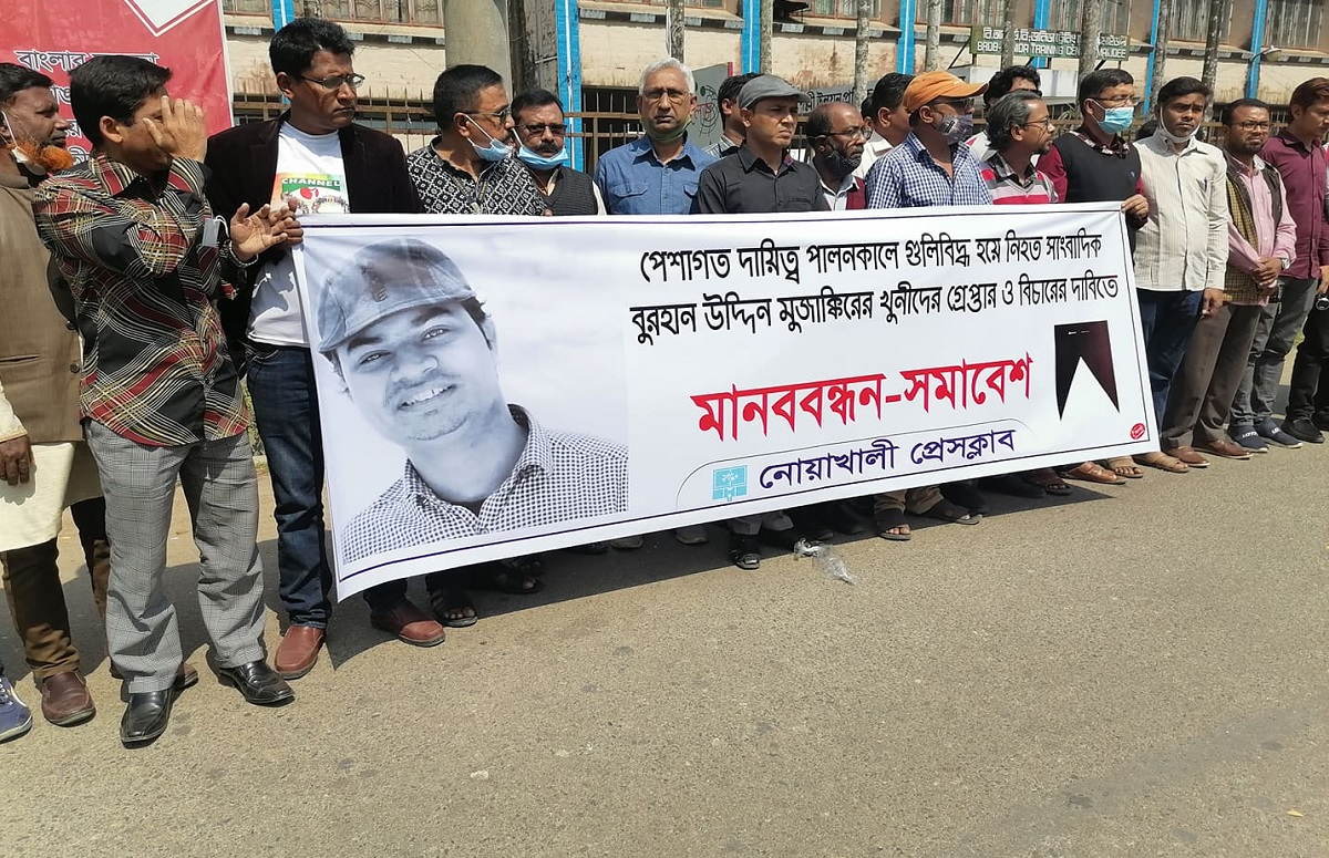 নোয়াখালীর কোম্পানীগঞ্জে পেশাগত দায়িত্ব পালনকালে আওয়ামী লীগের দু’পক্ষের সংঘর্ষে গুলিবিদ্ধ সাংবাদিক বুরহান উদ্দিন মুজাক্কির নিহতের ঘটনার প্রতিবাদে মানববন্ধন করেছে জেলায় কর্মরত সাংবাদিকবৃন্দ। এ সময় এ হত্যাকাণ্ডের সাথে জড়িতদের দ্রুত গ্রেফতার ও বিচারের দাবিতে সমাবেশ করা হয়।