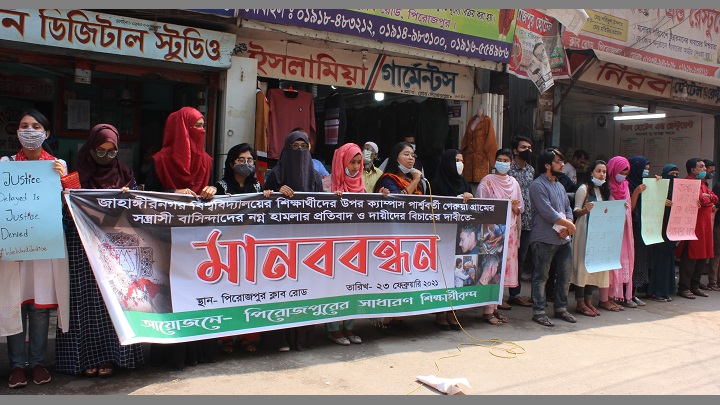 মঙ্গলবার দুপুরে টাউন ক্লাব সড়কে পিরোজপুরের শিক্ষার্থীদের উপস্থিতিতে এ মানববন্ধন অনুষ্ঠিত হয়। মানববন্ধনে বক্তারা বরিশাল বিশ্ববিদ্যালয়ের শিক্ষার্থীদের ওপর রাতের আধারের সশস্ত্র হামলা ও নারী শিক্ষার্থীদের লাঞ্ছনাসহ জাহাঙ্গীরনগর বিশ্ববিদ্যালয়ের শিক্ষার্থীদের উপর ক্যাম্পাস পার্শ্ববর্তী গেরুয়া গ্রামের সন্ত্রাসী বাসিন্দাদের নগ্ন হামলার তীব্র নিন্দা ও প্রতিবাদ জানান।