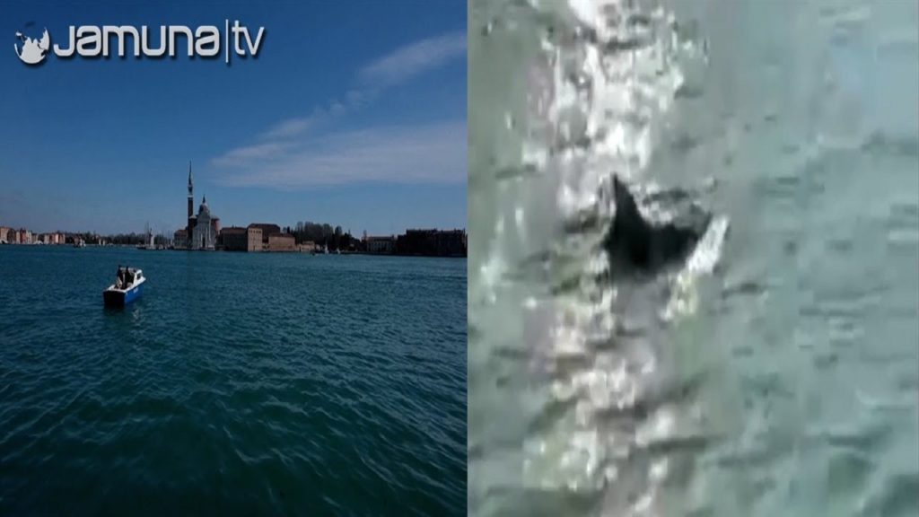 পানিতে নৌযানের চলাচল সীমিত করায় নগরীর মূল ক্যানেল ‘জিওডেকা’য় ঘুরে বেড়াচ্ছে একদল ডলফিন।