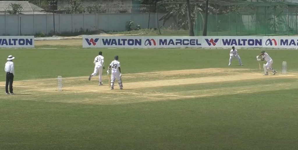 আগের দিনে করা ৭ উইকেটে ১৭৭ রান নিয়ে চতুর্থ দিনের খেলা শুরু করেছিল বরিশাল বিভাগ। দলীয় ১৮৪ রানে ফজলে মাহমুদকে এলবিডাব্লিউয়ের ফাঁদে ফেলেন আবু হায়দার রনি।