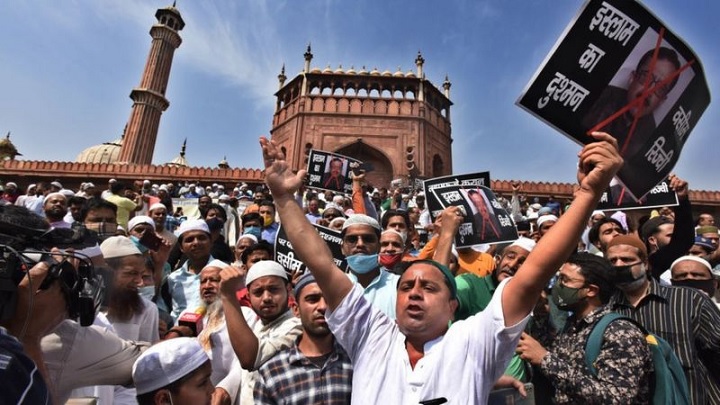 দিল্লির জামা মসজিদের সামনে সৈয়দ ওয়াসিম রিজভির বিরুদ্ধে বিক্ষোভ। ছবি- বিবিসি।