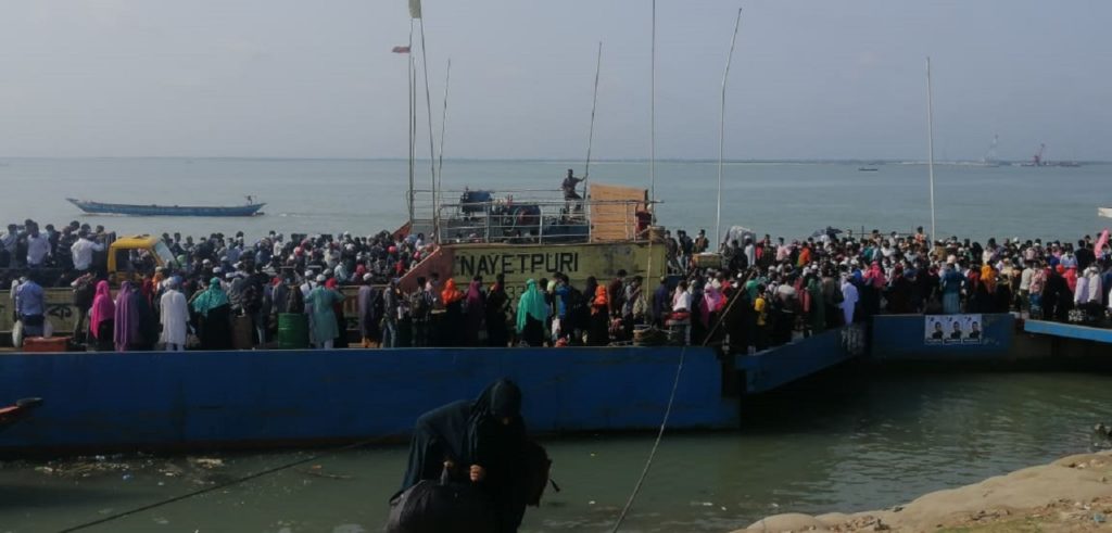 সকালে শিমুলিয়া ফেরিঘাটে মানুষের তেমন সমাগম ছিলো না। তবে, বেলা বাড়ার সাথে সাথে ঘাটে ঢাকা ফেরা মানুষের চাপ বাড়ে।