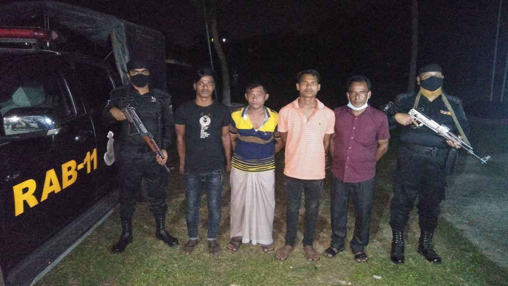 বুধবার দুপুরে র্যাবের এক প্রেস বিজ্ঞপ্তিতে জানানো হয়, গোপন সংবাদের ভিত্তিতে র্যাব-১১, নরসিংদীর একটি দল অভিযান চালিয়ে নরসিংদী পৌর এলাকা থেকে চোলাই মদসহ হুমায়ুন কবির (৫০), সাকিব (২০), গোবিন্দ দাস (২২), ও তপন দাশ (৪২) নামে চার ব্যবসায়ীকে গ্রেফতার করেছে। এসময় তাদের কাছে থাকা ৪টি জারিক্যানে ভর্তি অন্তত ৬০ লিটার চোলাই মদ ও নগদ টাকা উদ্ধার করা হয়।