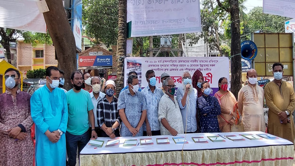 কর্মসূচিতে অবিলম্বে ব্রাহ্মণবাড়িয়া তাণ্ডবের নেপথ্যের নায়ক হেফাজতে ইসলামের জেলা শাখার সভাপতি মাওলানা সাজিদুর রহমান ও সাধারণ সম্পাদক মাওলানা মাওলানা মোবারক উল্লাহকে গ্রেফতারের দাবি জানানো হয়। অন্যথায় কঠোর আন্দোলনের ঘোষণা দেয়া হয়।