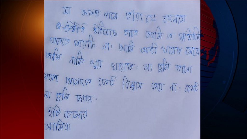 বরগুনায় মায়ের কাছে চিরকুট লিখে গলায় ফাঁস দিয়ে আত্মহত্যা করেছে সামিরা নামে এক কিশোরী (১৪)। সোমবার (৫ জুলাই) সকাল সাড়ে ১০টার দিকে কলেজ রোডের ভাড়াটিয়া বাসার বাথরুম থেকে তার ঝুলন্ত মরদেহ উদ্ধার করা হয়। আবেগাত্মক ওই চিরকুটে সামিরা লেখেন, আমার নামে তারা যে বদনাম উঠিয়েছে, তাতে আমি আর এ পৃথিবীতে থাকতে পারছি না। তিনি লেখেন, আমি নাকি খুব খারাপ মেয়ে। তুমি ছাড়া আমাকে কেউ বিশ্বাস করে না। কিশোরীর আত্মহত্যার জন্য দায়ী অভিযোগে উত্যক্তকারী জামাল হোসেনকে আটক করে পুলিশে সোপর্দ করেছে স্থানীয়রা।