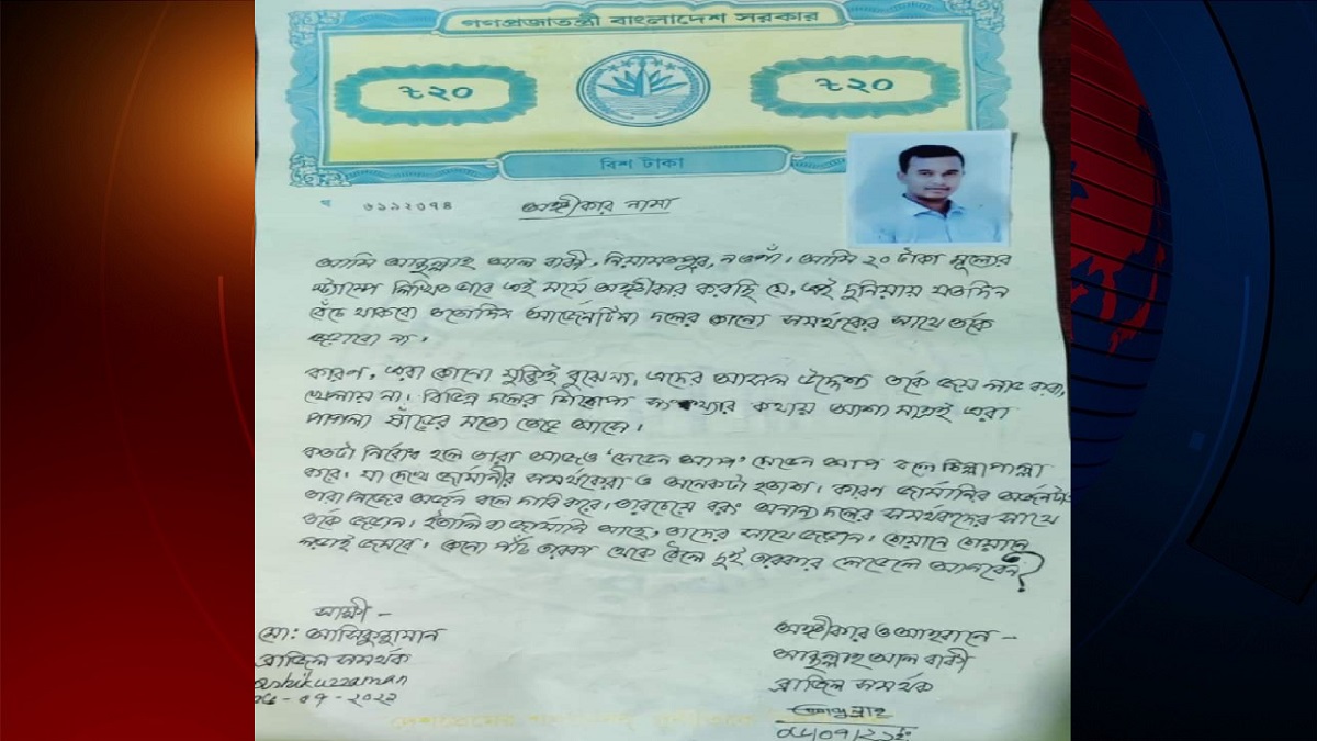 ‘আমি আব্দুল্লাহ আল বাকী, নিয়ামতপুর, নওগাঁ। আমি ২০ টাকার মূল্যের স্ট্যাম্পে লিখিতভাবে এই মর্মে অঙ্গীকার করছি যে, এই দুনিয়ায় যতদিন বেঁচে থাকবো ততদিন আর্জেন্টিনা দলের কোন সমর্থক এর সাথে তর্কে জড়াবো না।’