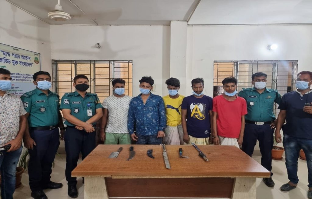 সোমবার ভোর রাতে এরশাদনগর বাসস্ট্যান্ডের বিপরীত পাশে নিপ্পন গার্মেন্টসের সামনে থেকে তাদের আটক করা হয়। এ সময় তাদের কাছ থেকে দেশীয় সামুরাই, চাইনিজ কুড়ালসহ ৫টি ধারালো অস্ত্র উদ্ধার করা হয়।