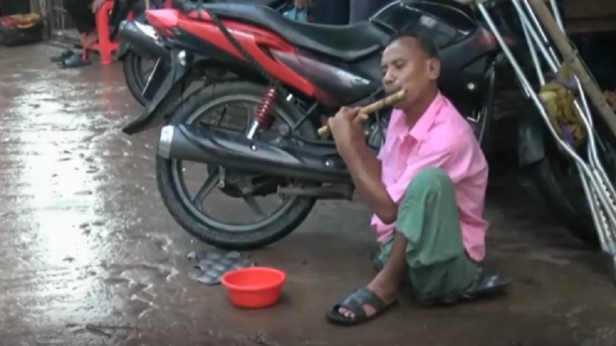 রাঙামাটি শহরের বনরূপা বাজারের প্রবেশমুখে বাঁশি বাজাচ্ছেন অন্ধ ও পঙ্গু শোভানন্দ।