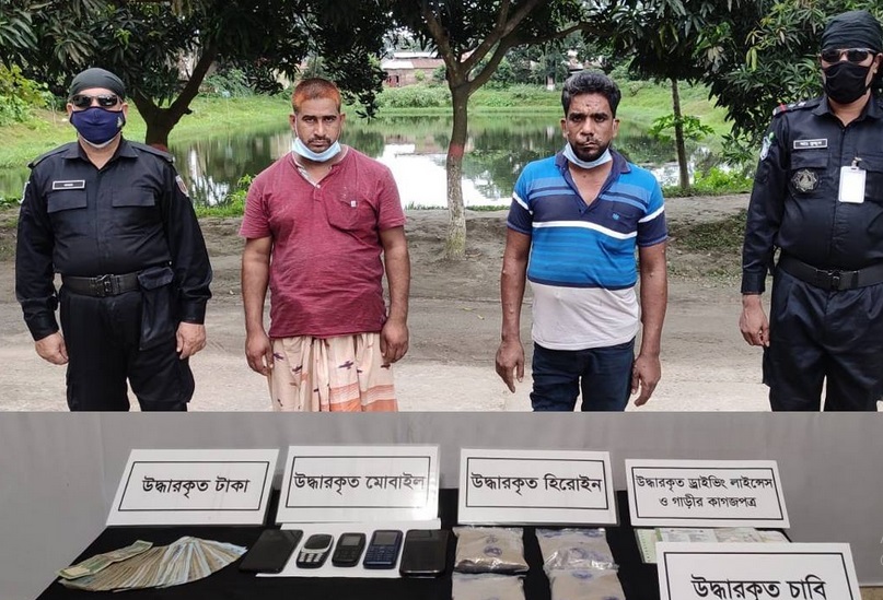 হেরোইন বহনকালে র‍্যাবের হাতে গ্রেফতার আজিজুর রহমান এবং বুলবুল আহম্মেদ।