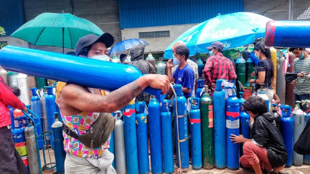 ইয়াঙ্গুনের এক অক্সিজেন সরবরাহ কেন্দ্রে দুশোরও বেশি মানুষের লাইন। একটি সিলিন্ডার রিফিলের জন্য ঘণ্টা, কখনও দিনও পার হয়ে যায়।