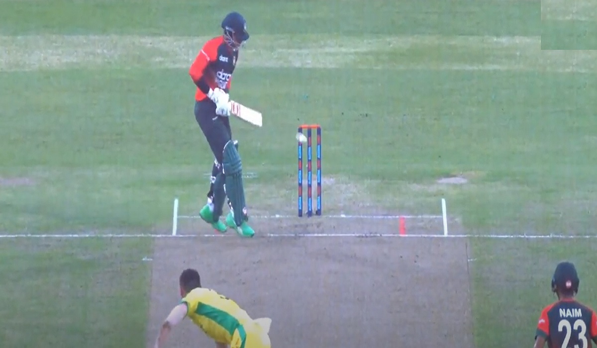 জস হ্যাজলউডের বলে খুব একটা সুবিধা করতে পারছিলেন না ওপেনার সৌম্য সরকার। অজি পেসার হ্যাজলউডের উইকেট টু উইকেট বলের জবাবে জন্য ইম্প্রোভাইজেশনের আশ্রয় নেয়ার কথাই হয়তো ভেবেছিলেন সৌম্য। সরে গিয়ে জায়গা করে অনেক বাইরের বলকে স্টাম্পে টেনে এনে সৌম্য নিজেকেই ছুড়ে দিলেন ক্রিজের বাইরে।