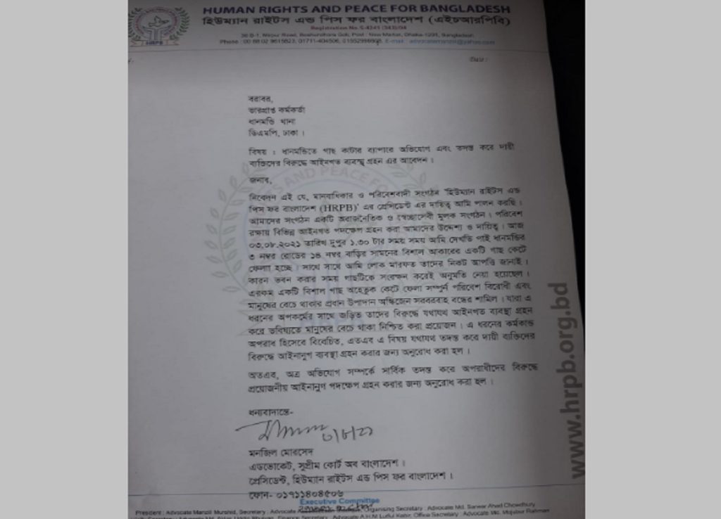 মঙ্গলবার (৩ আগস্ট) দুপুরে ধানমন্ডি থানার ভারপ্রাপ্ত কর্মকর্তা বরাবর এ আবেদন জানিয়েছেন মানবাধিকার ও পরিবেশবাদী সংগঠন হিউম্যান রাইটস অ্যান্ড পিস ফর বাংলাদেশ (HRPB) এর প্রেসিডেন্ট সুপ্রিম কোর্টের আইনজীবী মনজিল মােরসেদ।