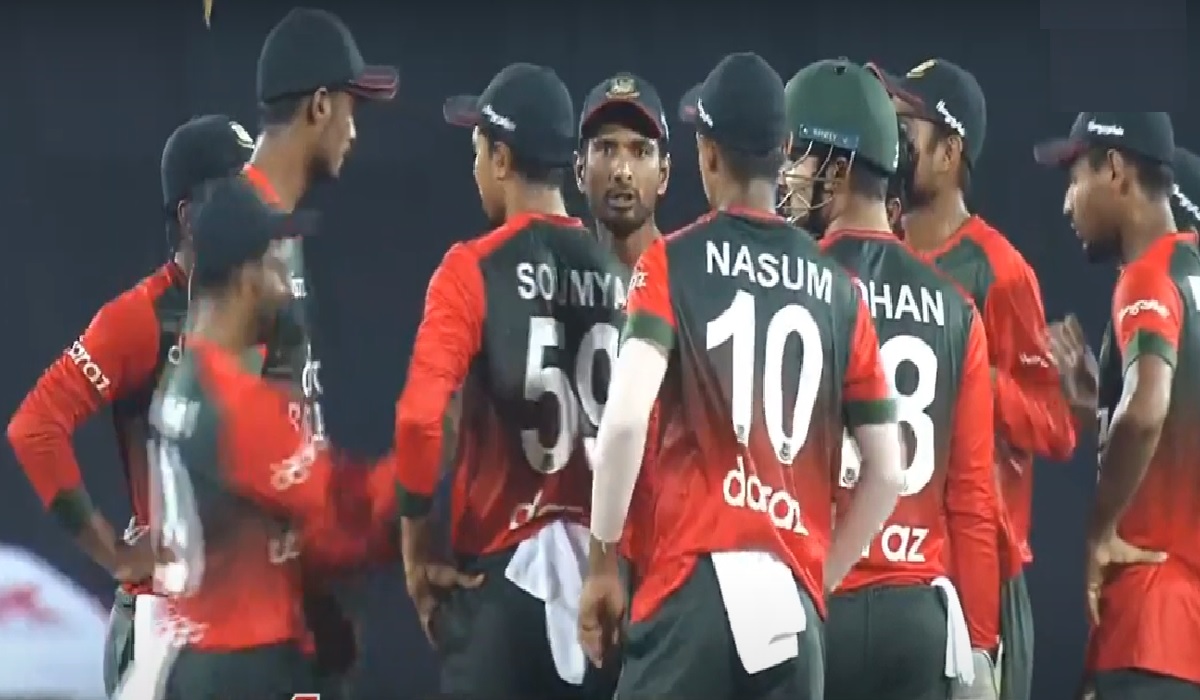 হেনরিক্সকে বোল্ড করার পর সাকিবকে ঘিরে টাইগার সতীর্থদের উল্লাস।