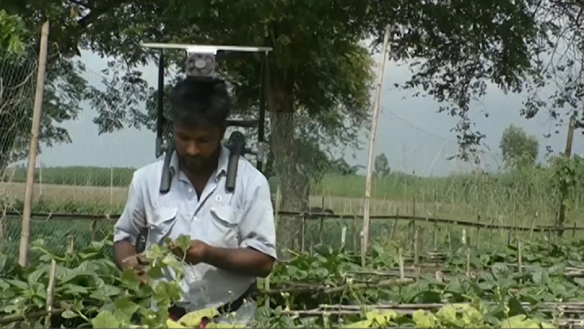 সোলার ফ্যান মাথায় কাজ করছে কৃষক।